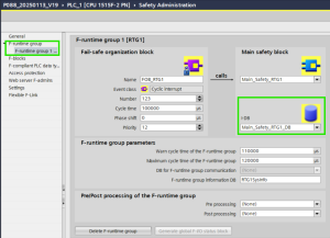 Desde el safety administration, en la pestaña F-runtime group podemos añadir nuestro main_safety y el FOB_RTG1, añadiendo los que sean necesarios. Una vez creado, se crea un DB asociado también al main_safety.
